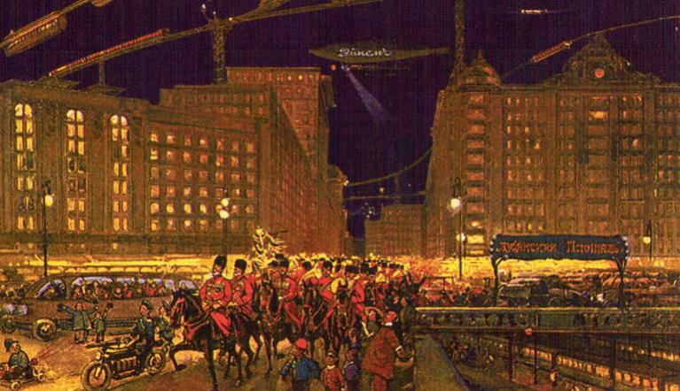 В 1914 году кондитерская компания «Эйнем» (которая после революции стала называться «Красный Октябрь») выпустила серию открыток «Москва будущего». Художник представил, как будет выглядеть Москва в 2259 году.