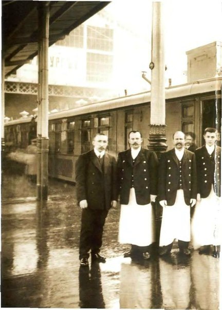 Обслуживающий персонал Транссибирского экспресса на перроне Петербургского Николаевского вкз, 1900 годы.
