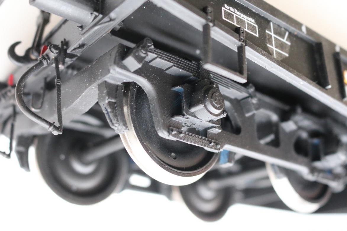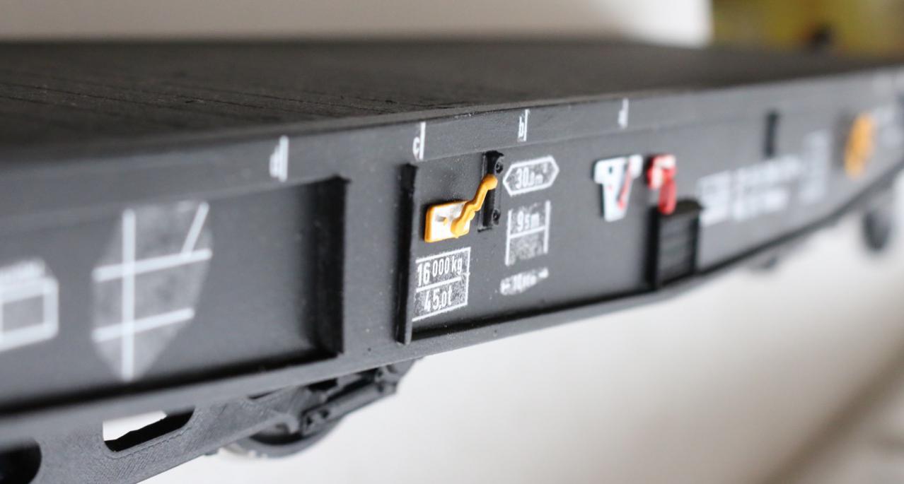 Длина модели: 488мм; ширина: 140мм; высота: 59мм. Винтовые сцепочки сделаны по-честному - завинчиваются как надо - с левой и правой резьбой. Крюк продпружинен. Буфера хорошо подпружинены; ход 7мм; левая тарелка плоская, правая выпуклая. Кол.пары польского производства, диаметр с гребнями 47мм. Тележки и сама платформа сделаны 3D-печатью из ABS. Настил сверху деревянный, но, не каждая досочка в отдельности, а сплошной лист с пропилами. Последний раз редактировалось VovaTuf; 14.11.2016 в 15:59. |