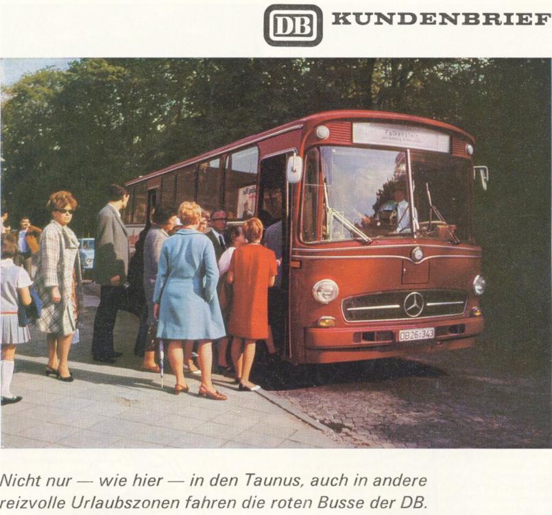 Автобусный филиал немецкого железнодорожного ведомства как до войны, так и после активно себя рекламировал. Выходили постеры, красочные расписания рейсов и даже рассылались клиентские карты с картинкой автобуса и примерно, таким текстом: "Не только сюда, в Таунус (курортное местечко), но и в другие популярные места отдыха можно добраться на красном автобусе DB"