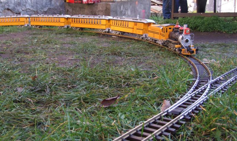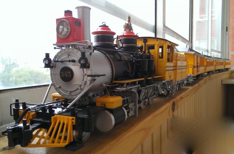 Вид вагонов в составе с соответствующим паровозом. Специально по цвету подбирал (боялся, что цвет будет отличаться; почти не отличается). Жёлтый с двумя чёрными полосами американцы назвали BumbleBee (Шмель).