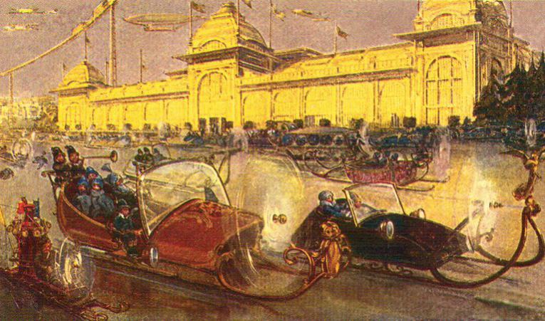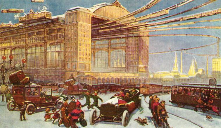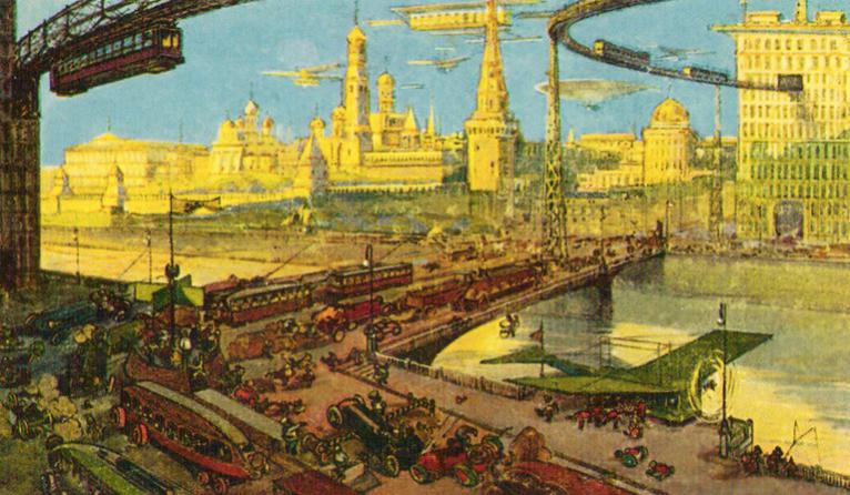 В 1914 году кондитерская компания «Эйнем» (которая после революции стала называться «Красный Октябрь») выпустила серию открыток «Москва будущего». Художник представил, как будет выглядеть Москва в 2259 году.