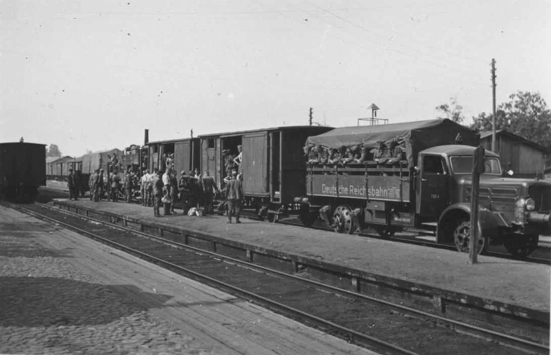 фото из семейного альбома одного немецкого оккупанта, который во время войны был водителем при штабе командования 4-й панцергруппы вермахта. На снимке запечатлен любопытный поезд-шаттл с двумя грузовиками на железнодорожном ходу с двух сторон поезда. Но самое главное - поезд состоит из двух советских вагонов НТВ и платформы (на снимке не понятно - это 16-ти или 20-ти тонная платформа). Снимок датирован 1941-м годом