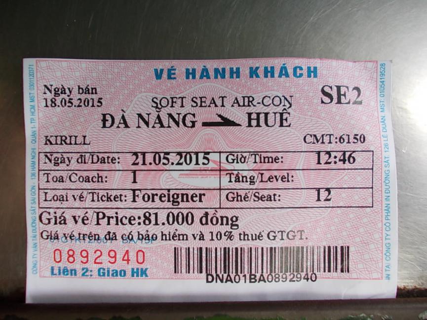 Сначала мы поехали из города Да-Нанг (середина страны) в город Хюэ, для осмотра императорского дворца. Вагон был сидячий, хоть старый но с кондицинером и биотуалетом.