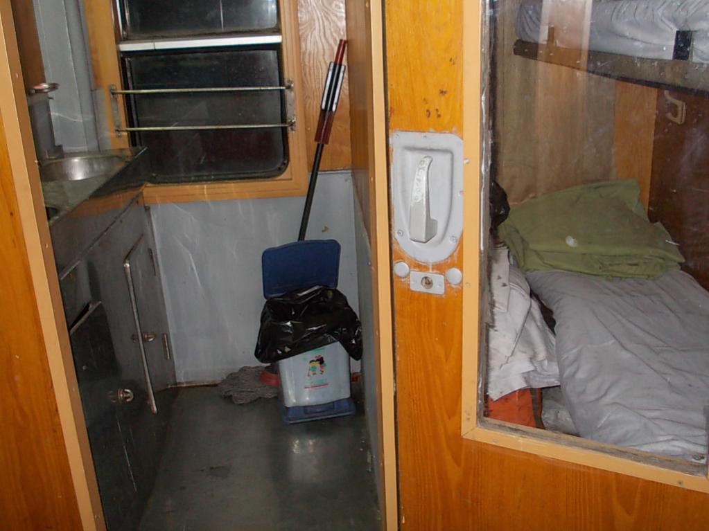 Из белья полагается только простыня на матрасе. Наволочка и вторая простыня отсутствует. В купе довольно холодно, кондиционер делает своё дело. К поезду прицеплен вагон с дизель-генератором и заодно это штабной вагон.